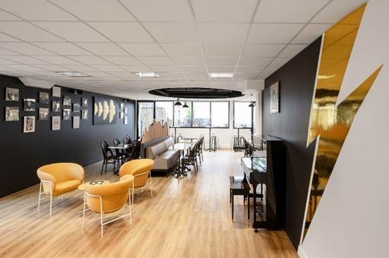 L’univers musical, cher à l’entreprise, sert de fil rouge à la décoration. Reproduction de pochettes de disques aux murs dans tous les espaces, équaliseur dans l’espace restauration, piano.