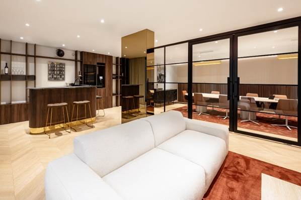 Odity soigne ses collaborateurs mais également ses clients. Et les recevoir doit être à la hauteur de son positionnement premium. L’entreprise a ainsi fait le choix de réserver une partie de ses espaces au rez de chaussée à « la Maison Odity ». Un espace de réception soigné, cosy, chic sans être ostentatoire, dans lequel on sent tout de suite bien accueilli. Bar, salon, salle de réunion mais aussi salle à manger pour organiser des repas préparés sur place par des chefs. Ces derniers disposent d’une cuisine à la hauteur de leurs talents.