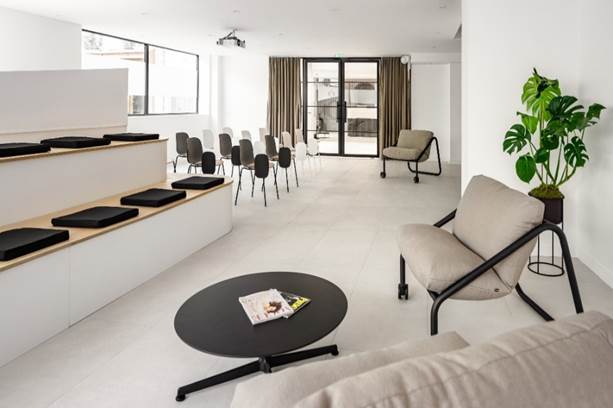 L’auditorium au rez de chaussée a été conçu pour être modulable et accueillir différents formats d’événements.